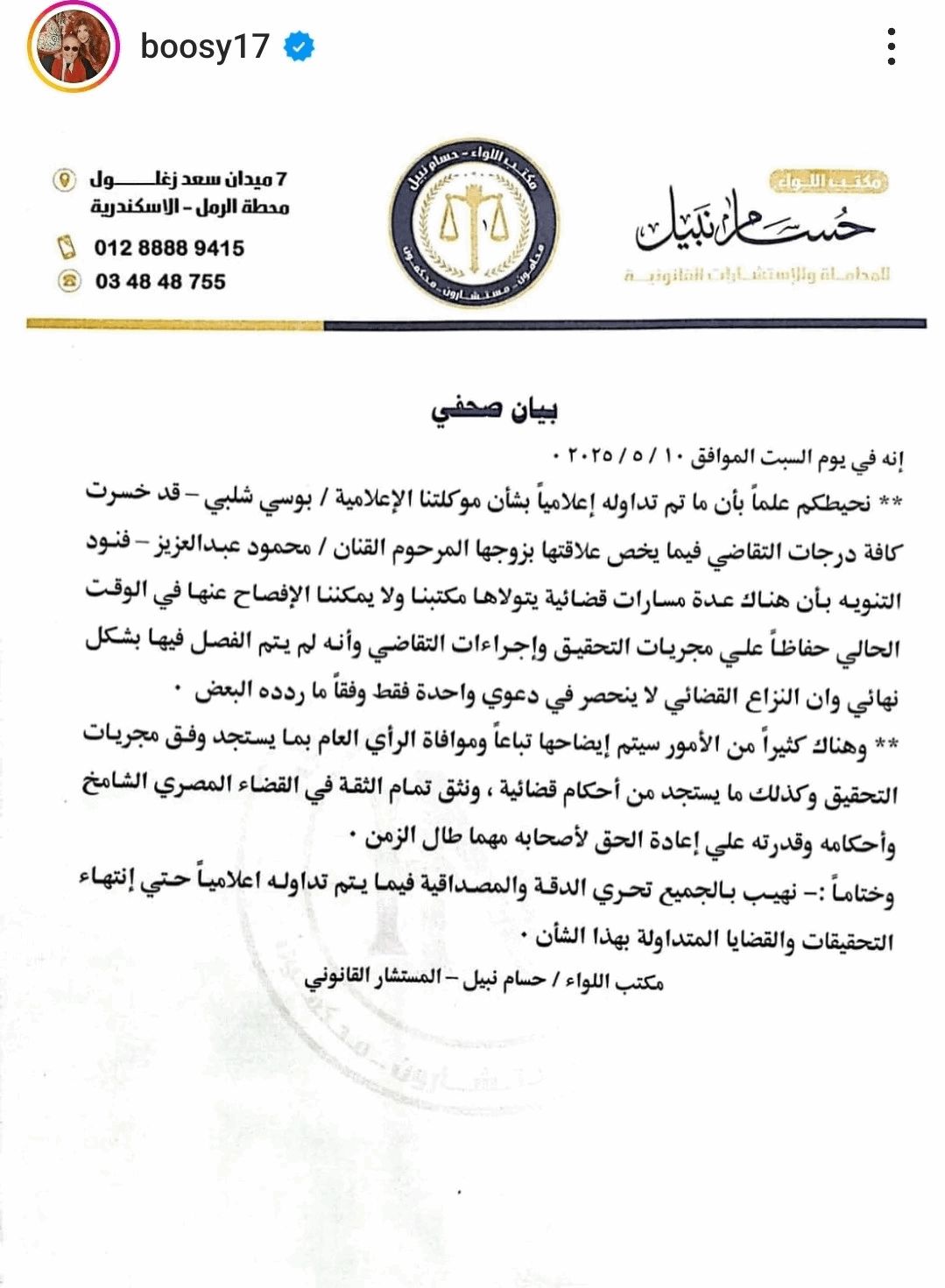 وشاركت بوسي متابعيها على انستغرام بصورة للبيان العاجل الصادر عن مكتب المحامي حسام نبيل وجاء فيه: "نحيط سيادتكم علماً بأن ما تم تداوله بشأن موكلتنا بوسي شلبي قد خسرت كافة درجات التقاضي فيما يخص علاقتها بزوجها الفنان الراحل محمود عبد العزيز نود التنويه بأن هناك عدة مسارات قضائية يتولاها مكتبنا ولا يمكن الإفصاح عنها فى الوقت الحالي حفاظاًعلى مجريات التحقيق واجراءات التقاضي، وانها لم يتم الفصل فيها بشكل نهائي وان النزاع القضائي لا ينحصر فى دعوي واحدة فقط وفقا ما ردده البعض".