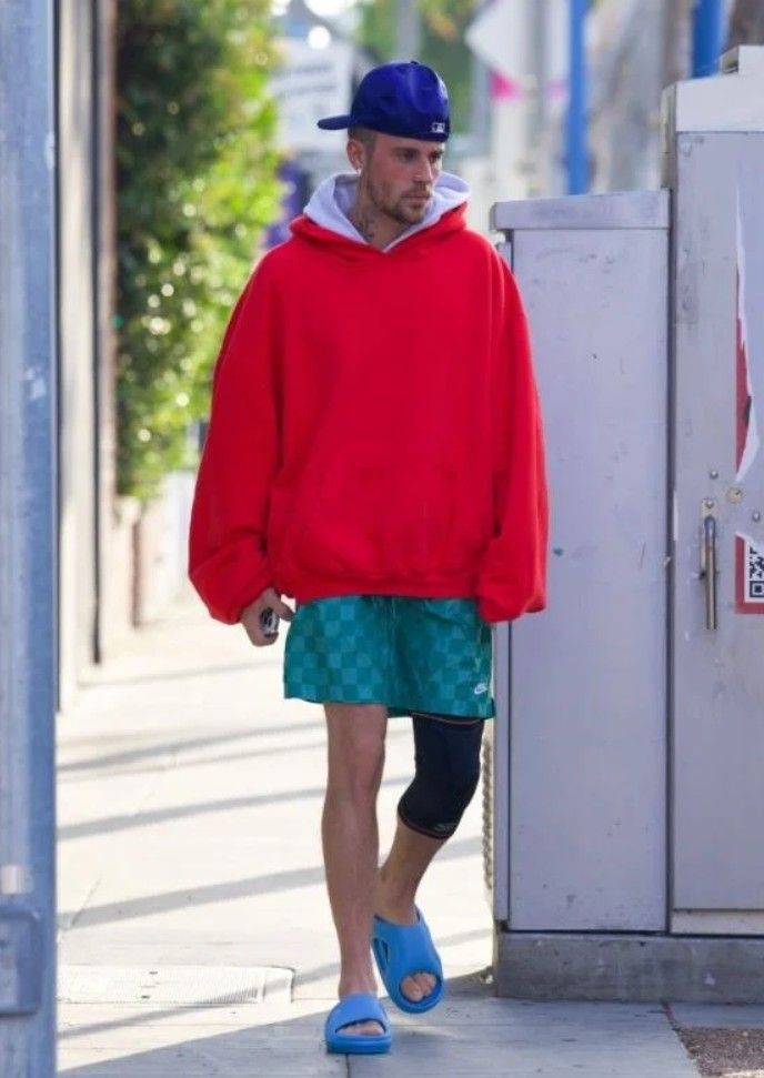 ورُصد بيبر وهو يتجول مرتدياً سترة حمراء واسعة وسروالًا أخضر منقوشاً، وقد لفتت الأنظار دعامة ركبة سوداء كبيرة كان يرتديها.