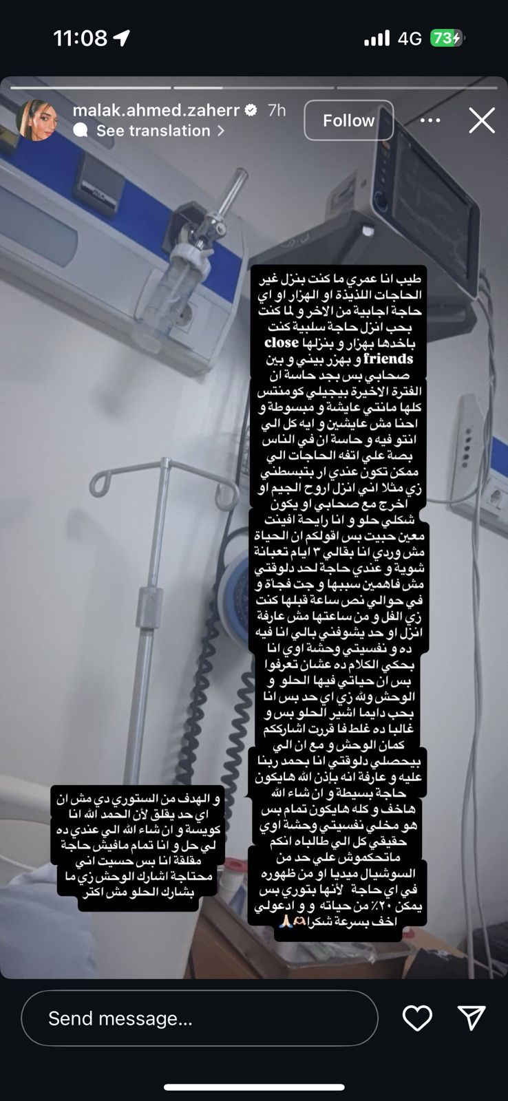 واختتمت: "كمان الوحش ومع إن اللي بيحصلي دلوقتي أنا بحمد ربنا عليه و عارفة انه بإذن الله هيكون حاجة بسيطة وإن شاء الله هخف وكله هيكون تمام بس و الهدف من الستوري دي مش إن أي حد يقلق لأن الحمد الله أنا هو مخلي نفسيتي وحشة أوي كويسة و ان شاء الله الي عندي ده حقيقي كل الي طالبه أنكم، ماتحكموش علي حد من السوشيال ميديا أو من ظهوره في اي حاجة لأنها بتوري بس يمكن ٢٠٪ من حياته".