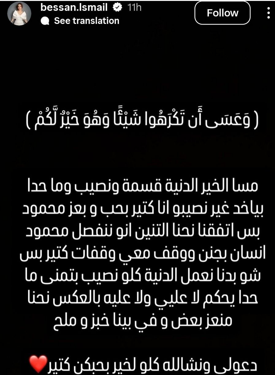 وأعلنت بيسان مساء أمس الاثنين، خبر الانفصال، في منشور عبر خاصية "الستوريز" في "إنستغرام"، بدأته بآية قرآنية: "وَعَسَى أَنْ تَكْرَهُوا شَيْئًا وَهُوَ خَيْرٌ لَكُمْ".