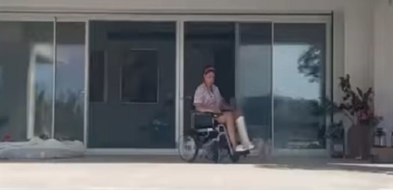 ونشرت الممثلة المصريّة فيديو، وهي على كرسيّ متحرّك، أمام حوض السباحة.