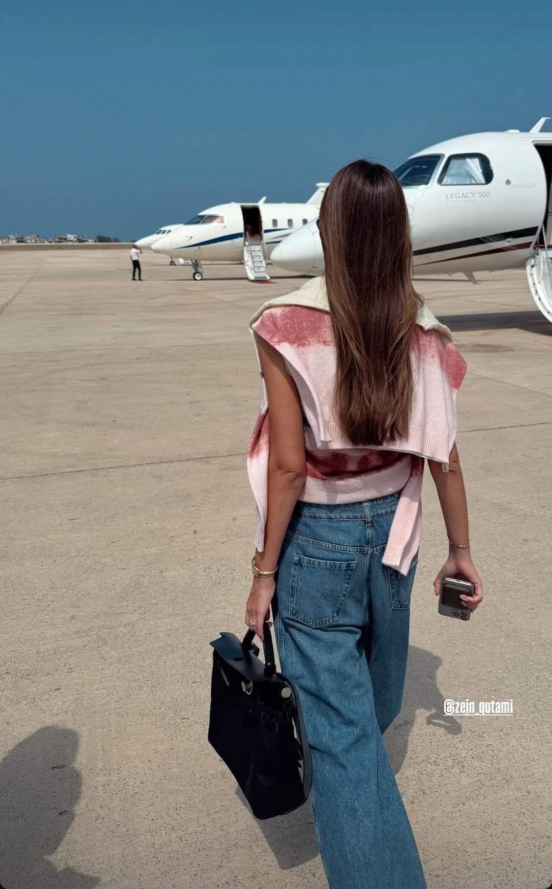 ونشر سيليو عبر خاصية الستوريز على حسايه على انستغرام صورة لزوجته وهي تسير باتجاه الطائرة الخاصة بإطلالة كاجوال أنيقة.