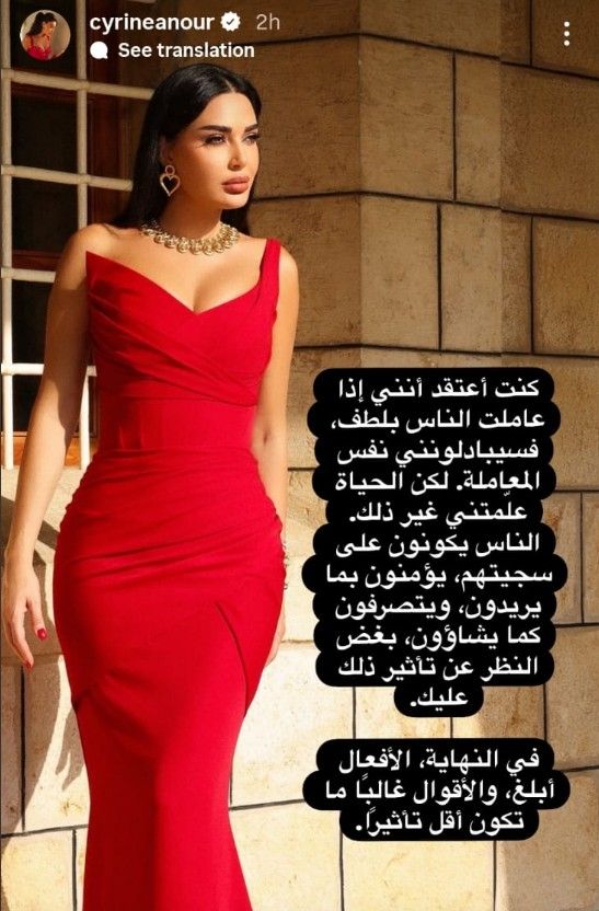 وقامت سيرين مؤخرا بنشر صورة لها عبر خاصية "الستوري" على حسابها على انستغرام وعلقت عليها بالقول: "كنت أعتقد انني إذا عاملت الناس بلطف فسيبادلونني نفس المعاملة. لكن الحياة علمتني غير ذلك. الناس يكونون على سجيتهم. يؤمنون بما يرديون ويتصرفون كما يشاؤون. بغض النظر عن تأثير ذلك عليك."
