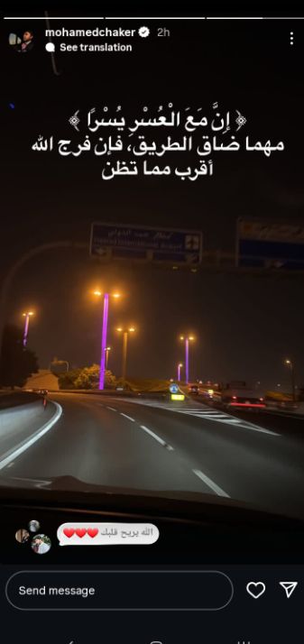وكتب شاكر عبر خاصية الستوري:" إن مع العسر يسر.. مهما ضاق الطريق، فإن فرج الله أقرب مما تظن".