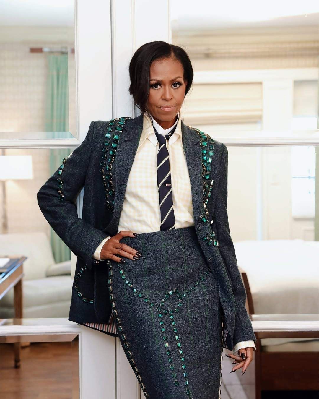 هذه الإطلالة تعكس قدرة ميريديث كوب على ترجمة شخصية ميشيل أوباما إلى لغة أزياء واضحة تجمع بين الفخامة، الحداثة، والعملية.