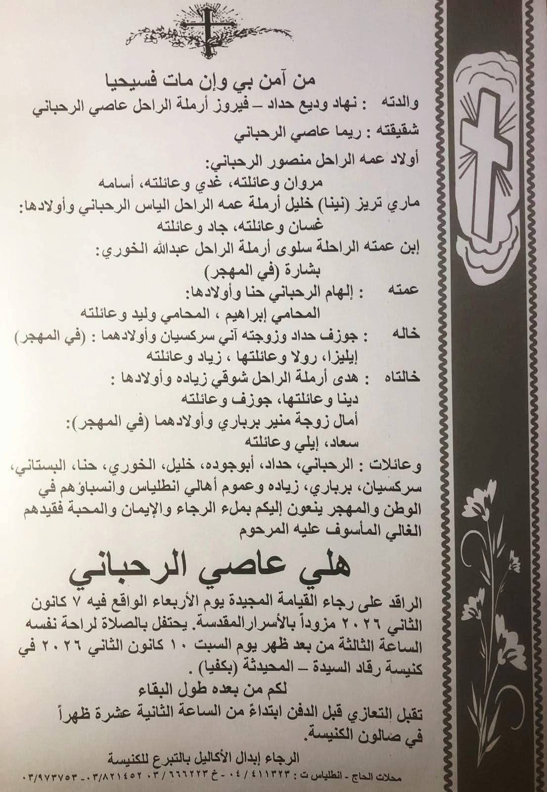 يُحتفل بالصلاة لراحة نفسه عند الساعة الثالثة من بعد ظهر يوم السبت 10 كانون الثاني، في كنيسة رقاد السيدة - المحيدثة بكفيا.