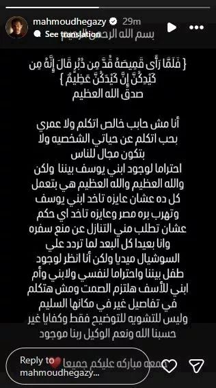 وكتب حجازي عبر خاصية القصص القصيرة على حسابه بموقع التواصل الاجتماعي "انستجرام": "أنا مش حابب خالص أتكلم ولا عمري بحب أتكلم عن حياتي الشخصية، ولا بتكون مجال للناس احتراما لوجود ابني يوسف بيننا، ولكن والله العظيم والله العظيم هي بتعمل كل ده عشان عايزة تاخد ابني يوسف وتهرب برة مصر، وعايزة تاخد أي حكم عشان تطلب مني التنازل عن منع سفره".
