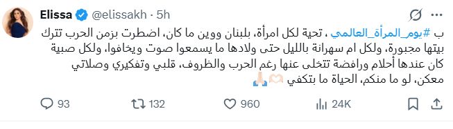 وسلطت إليسا الضوء على الأمهات اللواتي يحمين أطفالهن من الخوف والقصف، وعلى الفتيات المتمسكات بأحلامهن رغم قسوة الظروف، مؤكدة أن قلبها وتفكيرها وصلاتها مع هؤلاء النساء، ومشددة على أن المرأة تبقى عماد الحياة واستمرارها حتى في أصعب الأوقات.