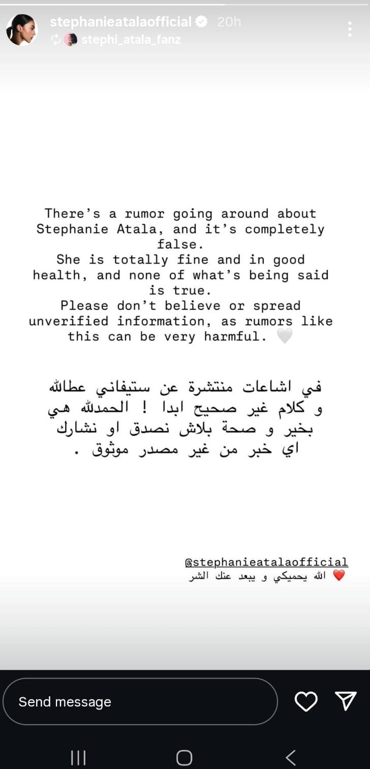 وقال المنشور: "فيه إشاعات منتشرة عن ستيفاني عطالله وكلام غير صحيح أبداً!"