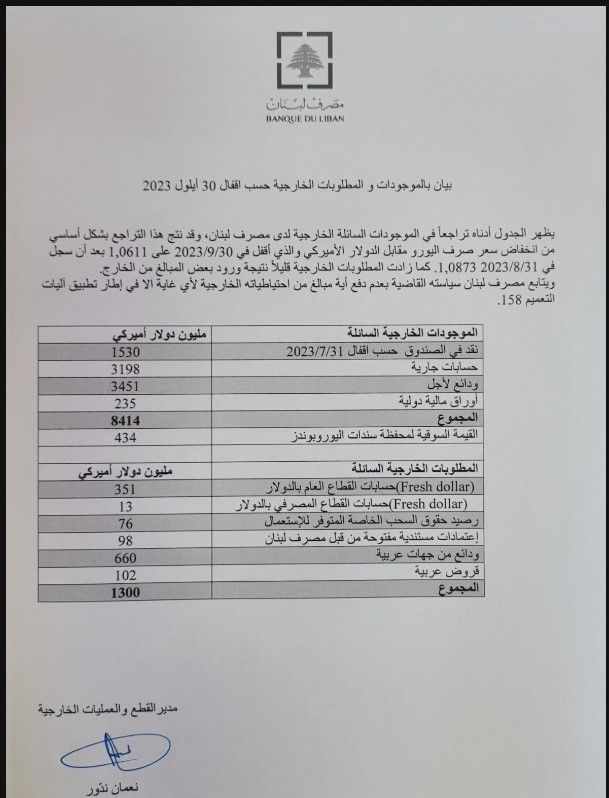 أصدر مصرف لبنان بياناً، بالموجودات والمطلوبات الخارجية حسب اقفال 30 أيلول 2023.