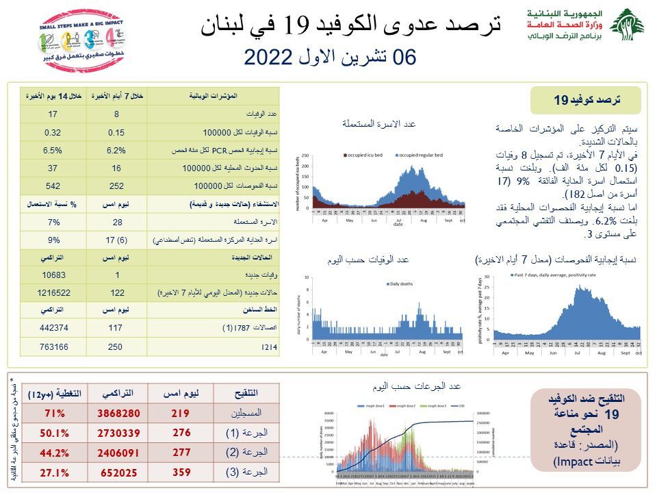 أعلنت وزارة الصحة العامة عن تسجيل 122 إصابة جديدة بفيروس كورونا ليرتفع العدد التراكمي للإصابات منذ بدء انتشار الوباء إلى 1216522. كما وسجل لبنان حالة وفاة واحدة ما رفع العدد التراكمي للوفيات إلى 10683.