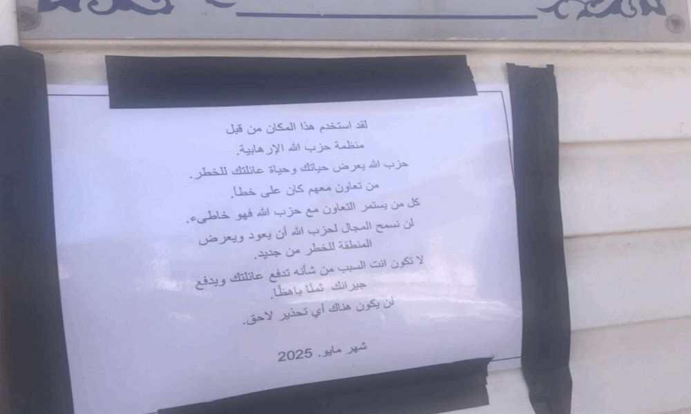 عثر على منشور، اليوم الجمعة، على جدران احد منازل بلدة عيتا الشعب في قضاء بنت جبيل، كتب عليه: “هذا المكان استخدم من قبل منظمة حزب الله، ولن نسمح المجال لحزب الله ان يعود ويعرض المنطقة للخطر من جديد. لن يكون هناك اي تحذير لاحق”.