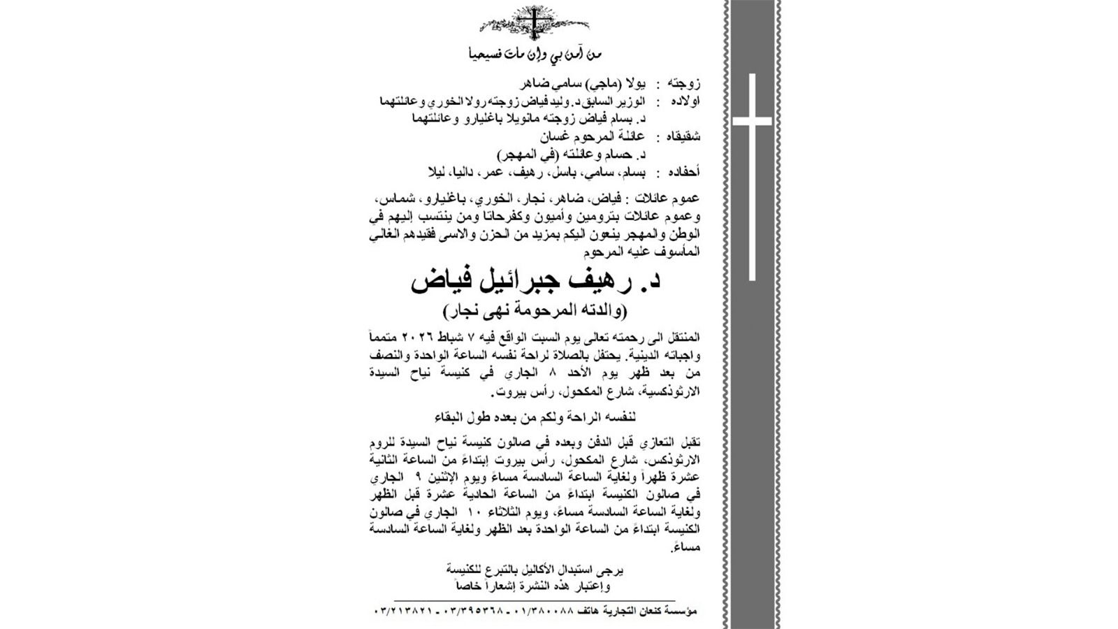 توفّي والد زير الطاقة السابق وليد فياض، رهيف جبرائيل فياض. ويحتفل بالصلاة لراحة نفسه الساعة الواحدة والنصف من يوم غد الأحد في كنيسة نياح السيدة الأرثوذكسية، شارع المكحول – رأس بيروت.