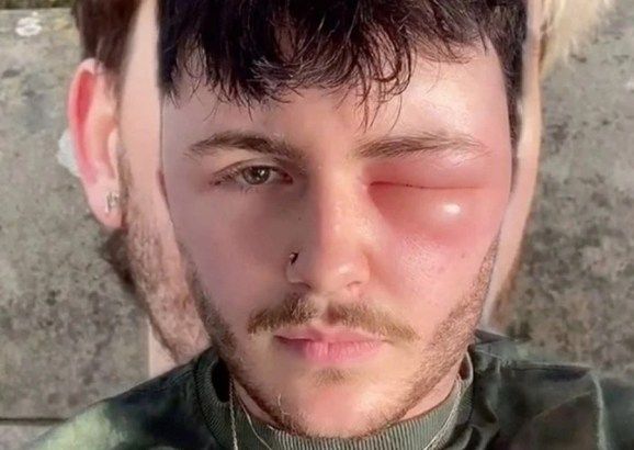 واتضح في الفيديو، كيف أن التورم الخفيف على إحدى العينين أدى في النهاية إلى نمو حجم وجهه بالكامل وتحويله إلى اللون الأحمر الفاتح؛ ليتم نقله فورًا إلى المستشفى، فيما كان يجب إجراء اختبار الحساسية قبل الاستخدام الكامل للصبغة.