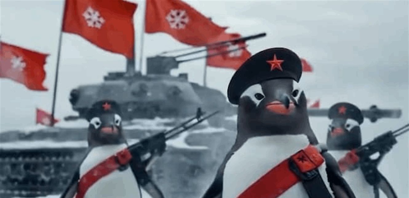 ويُظهر الفيديو المُولّد بالذكاء الاصطناعي، والذي نشرته NEXTA، وهي وسيلة إعلامية من شرق أوروبا، طيور البطريق من جزيرة مهجورة تحمل بنادق، وتُغني أغاني الحرب أثناء مسيرتها.