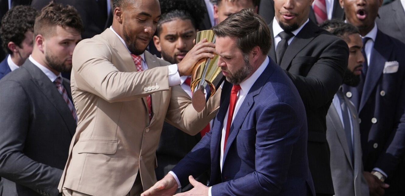 وأسقط فانس كأس بطولة كرة القدم الجامعية الوطنية في البيت الأبيض خلال زيارة فريق أوهايو باكايز.