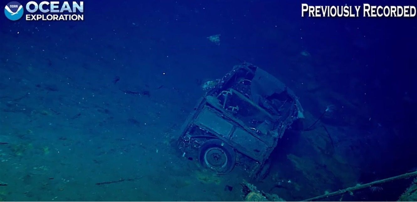رصد فريق استكشاف سيارة سوداء قديمة وسط حطام حاملة الطائرات الأميركية "يو إس إس يوركتاون" التي غرقت عام 1942 خلال معركة ميدواي الشهيرة.