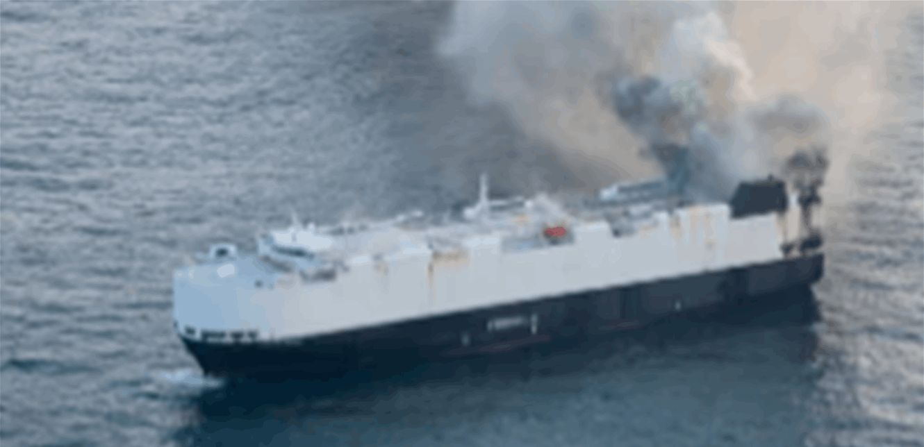 تطفو ناقلة السيارات "مورنينغ ميداس" كقنبلة موقوتة في المحيط الهادئ، بعد أن اشتعلت فيها النيران وهي تحمل قرابة 3000 مركبة، بينها 800 سيارة كهربائية، قبالة سواحل ألاسكا، يوم 3 حزيران.