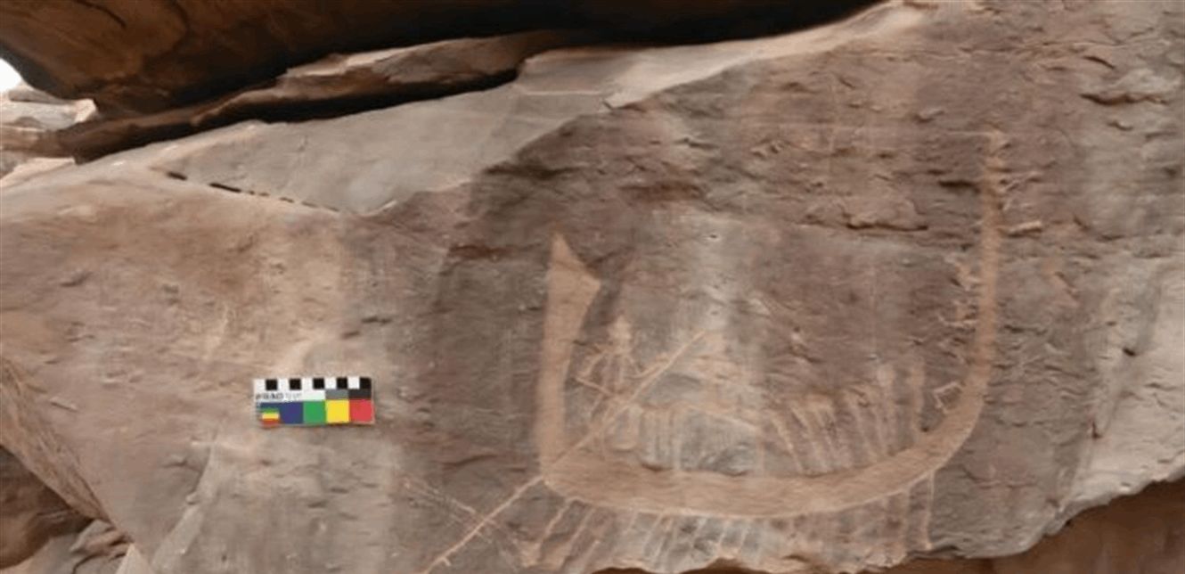 النقش، الذي نُشر في دراسة حديثة بمجلة العصور القديمة، يُظهر قاربًا مزخرفًا يُسحب بواسطة خمسة أشخاص، وعلى متنه شخصان، أحدهما يجلس داخل بناء يُشبه الهودج، في مشهد يُعتقد أنه يحمل دلالات رمزية على المكانة الاجتماعية أو الملكية. كما تبرز في النقش ملامح مثل الذقن الطويلة التي تُشبه اللحية الاصطناعية الملكية المعروفة في الفن المصري القديم.