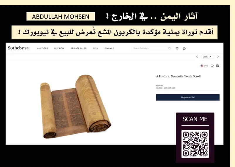 وأشار محسن إلى أن بيع هذه اللفائف يتم رغم وجود اتفاق ثقافي بين اليمن والولايات المتحدة، إلا أن ثغرات قانونية واسعة تسمح باستمرار التداول، إذ تُصنّف لفائف التوراة في القانون الأميركي كممتلكات دينية خاصة ليهود اليمن وليست جزءاً من التراث الوطني للدولة، ما يتيح بيعها خارج إطار الحظر. كما أن اليمن لم يتقدّم حتى الآن بأي اعتراض رسمي بشأن هذه اللفائف.