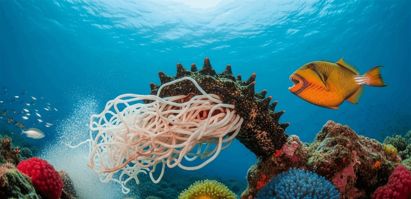 خيار البحر يُخرج أحشاءه: عندما يشعر خيار البحر بالخطر، يلجأ إلى خطة هروب جريئة. إذ يُطلق أعضاءه الداخلية من مؤخرته لإرباك المفترسات أو تشتيت انتباهها. لا داعي للقلق، فخيار البحر ينجو من هذه المحنة، ويعيد نمو أجزائه المفقودة في النهاية.