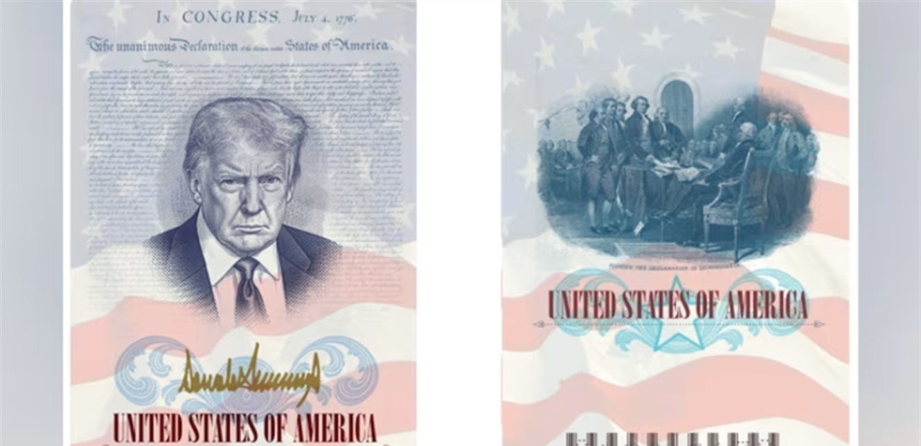 كما نشر حساب الخارجية الأميركية، النموذج الجديد الذي يتضمن في صفحاته الداخلية صورة لترامب مع توقيعه باللون الذهبي، إضافة إلى صورة للآباء المؤسسين يوم إعلان الاستقلال في 4 تموز 1776.
