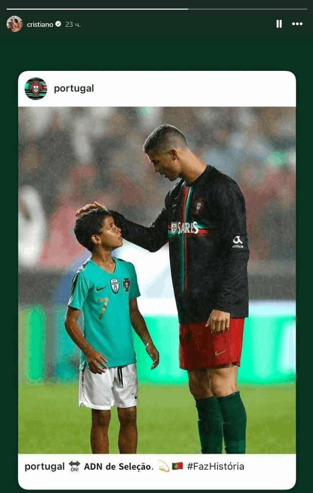 وبعد أن نشر الحساب الرسمي لمنتخب البرتغال صورة لرونالدو ونجله مع تعليق "DNA" للإعلان عن استدعاء نجل الأسطورة كريستيانو رونالدو لأول مرة لقائمة منتخب البرتغال تحت 15 عاما، قام رونالدو بإعادة نشر ذلك.