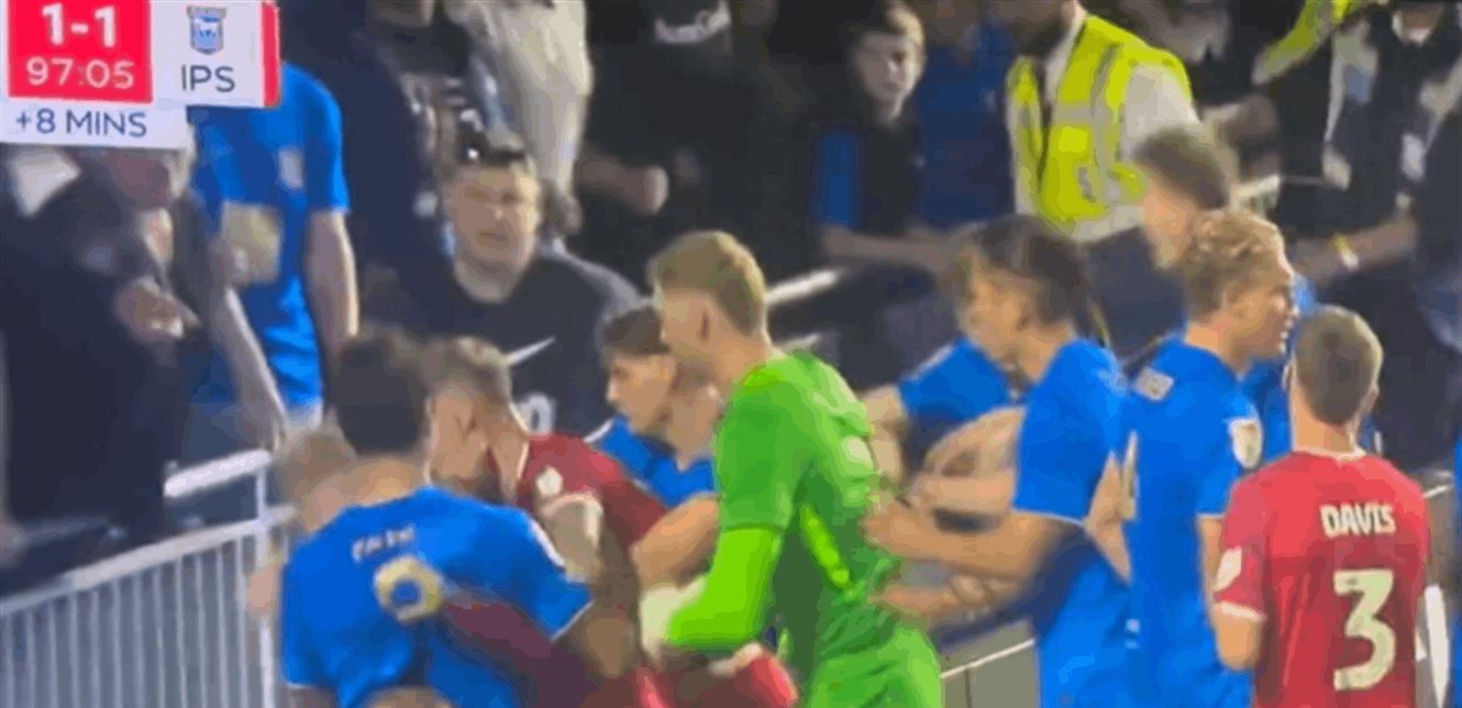 التوتر انتقل سريعاً إلى أرضية الملعب، حيث اندلع شجار بين لاعبي الفريقين، قبل أن يقتحم أحد المشجعين الملعب ويضع يديه على مدافع إيبسويتش دارا أوشيا، ليتدخل رجال الأمن بسرعة ويمنعوا تفاقم الموقف، فيما أُلقيت زجاجة باتجاه الملعب.