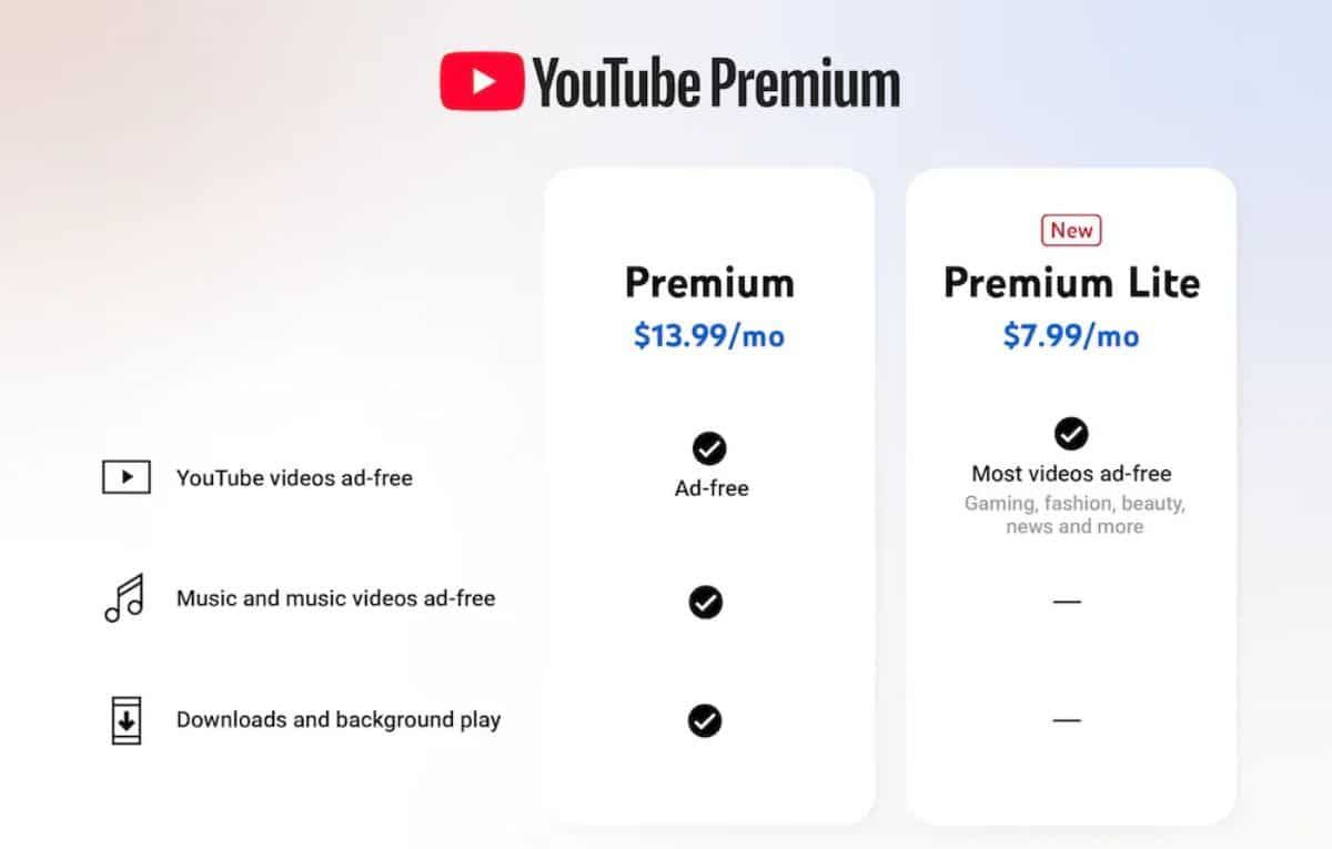 أعلنت يوتيوب طرح اشتراك جديد تحت اسم “بريميوم لايت Premium Lite“، يتيح للمستخدمين مشاهدة معظم مقاطع الفيديو دون إعلانات مقابل 8 دولارات شهريًا، وهو اشتراك أرخص مقارنةً باشتراك بريميوم الكامل الذي يبلغ سعره 14 دولارًا شهريًا.
