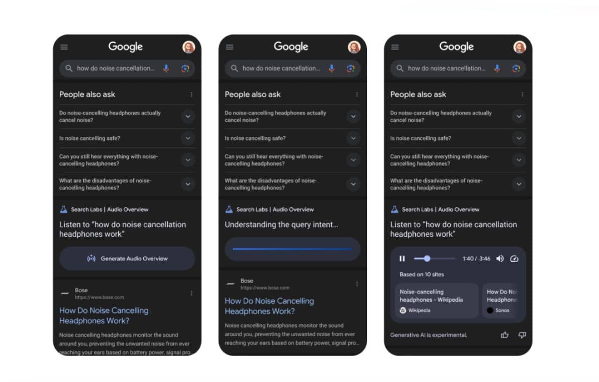 وتُعد الميزة مفيدة في تقديم شروحات موسعة حول الموضوعات المعقدة نسبيًا، لكنها ليست مخصصة للإجابات السريعة. وتجمع الميزة المعلومات من أبرز نتائج البحث في أول صفحة لمحرك جوجل، ثم تُركّبها في تسجيل صوتي ديناميكي.