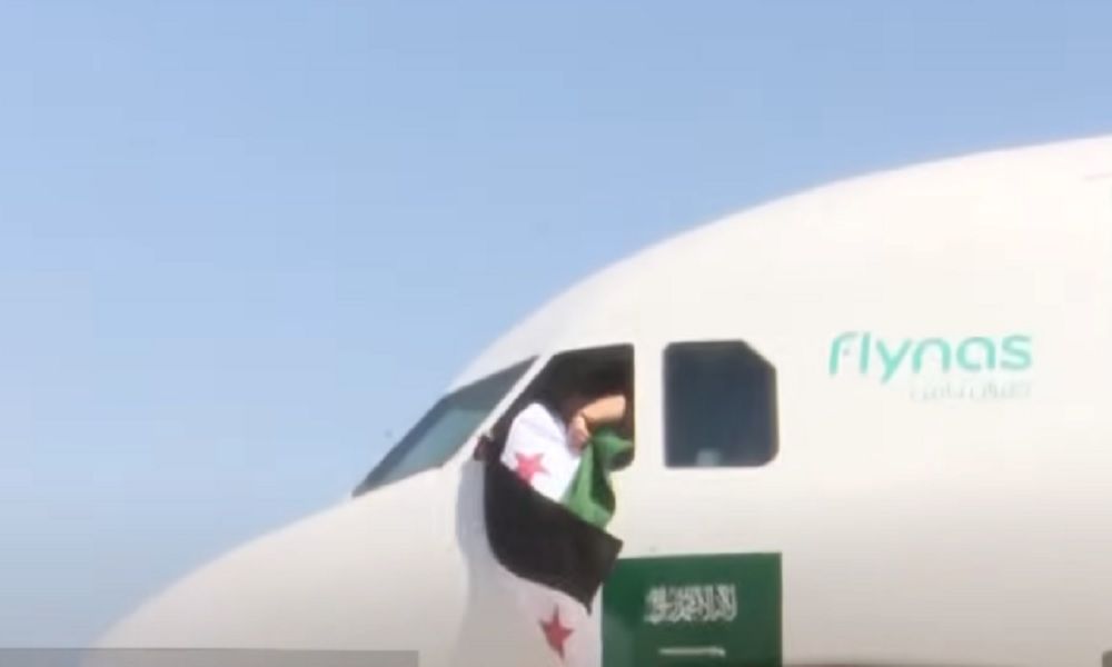 ورفع كابتن الطائرة العلم السوري الجديد فور توقفه في مطار دمشق.