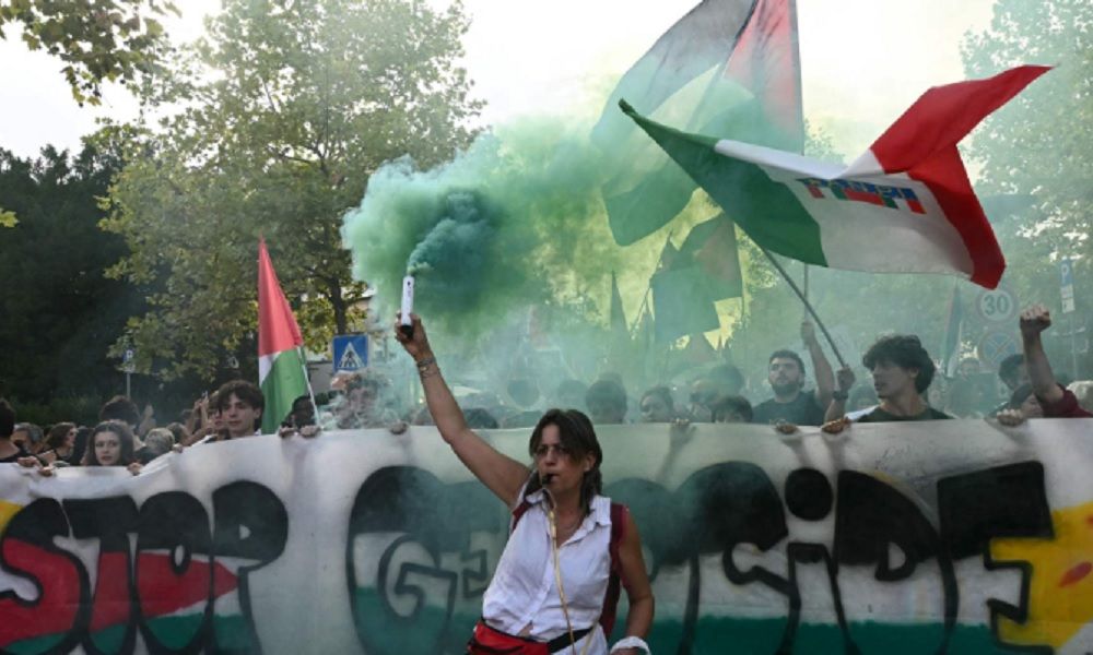 ورفعت خلال التظاهرة التي دعت إليها منظمات يسارية في منطقة البندقية، لافتات تدعو إلى مقاطعة إسرائيل ووضع حد للإبادة وسط عدد كبير من الأعلام الفلسطينية.