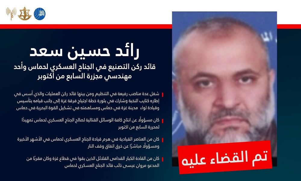 وقال: “كان المدعو رائد سعد من قادة حماس الكبار القلائل الذين بقوا في قطاع غزة وشغل سلسلة مناصب رفيعة في الجناح العسكري للحركة”.