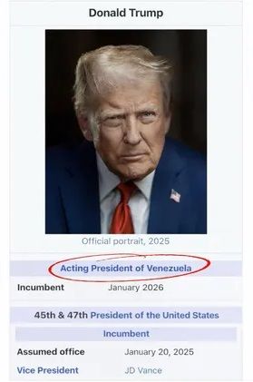 ونشر ترامب صورة له من ويكيبيديا تحت عنوان “رئيس فنزويلا بالوكالة”، ملمحًا بسخرية إلى شرعية ديلسي رودريغير، نائبة الرئيس نيكولاس مادورو، والتي تولت زمام السلطة بعد اعتقاله وزوجته في الثالث من كانون الثاني على يد قوة أميركية خاصة.